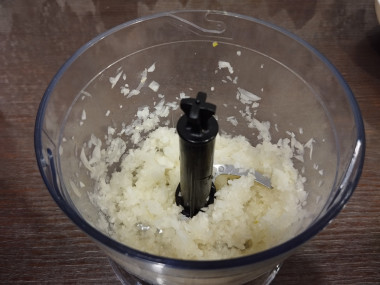 Отправьте лук с зубчиками чеснока в чашу блендера и измельчите в пюре.