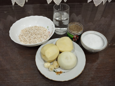 В емкость с овсяными хлопьями отправьте измельченный лук и чеснок. Посолите и поперчите по вкусу. Добавьте натертый картофель. Сливать жидкость с картофельной массы не нужно.