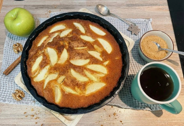 Оно как бы слегка обволакивает яблоки, и в этом суть. В духовке оно поднимется 5. Взять твердое сливочное масло и крохотными кусочками выложить на яблоки, сверху чуть присыпать сахаром и корицей по вкусу.Духовку разогреть до 180 градусов и печь минут 35–40.7. Можно оставить немного долек, чтобы их красиво выложить сверху пирога.