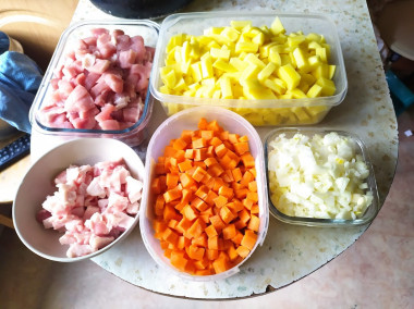 Лук и морковку измельчите произвольно. Я нарезала лук кубиками, а морковь тонкими брусочками. Картошку можно нарезать дольками либо не крупными квадртиками.