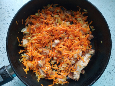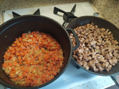 В казане или в кастрюле с толстым дном и краями разогрейте оставшееся масло. Отправьте лук с морковкой обжариваться. Готовьте около пяти минут, пока лук и морковь не приобретут золотистый оттенок.