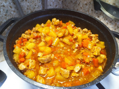 Невероятно вкусное получилось рагу из свинины с картошкой и овощами. Готовила на плите в казане. Обжарила мясо до золотистой корочки, потом в этом же масле лук с морковкой. Всё делала по рецепту. Только когда добавляла воду, добавила немного рассола из банки с маринованными огурцами. Получилось очень сытное, ароматное блюдо. В казане мясо и овощи приобретают особый вкус, томятся на слабом огне. Мясо получается нежное и мягкое, картошка рассыпчатая. Соки свинины и овощей пропитывают и дополняют друг друга. Рекомендую, прекрасный рецепт с подробным и доступным описанием.