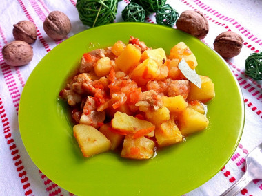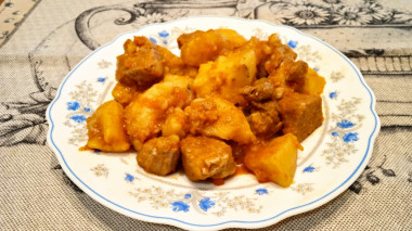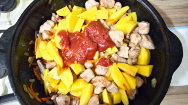 Замечательное блюдо для семейного ужина. Мои дети очень любят картошку с мясом, да и я тоже. У меня была свинина с прослойкой сала. Сало я срезала, мелко измельчила и вытопила выжирки. Сам жир слила, а к выжиркам добавила кусочки мяса и обжарила. Потом обжарила вместе с луком и морковью. Поджарку переложила в кастрюлю, добавила картошку и потушила. Томатную пасту правда добавила в последнюю очередь, хотелось, чтобы картошка успела развариться. Ведь томат кислый и не всегда дает картошке стать мягкой. Рагу из свинины с картошкой и овощами с добавлением томата мне понравилось, дети тоже быстро съели свои порции. Себе в тарелку добавила немного свежемолотого перца для аромата и небольшой остринки. Вкусное и сытное блюдо.