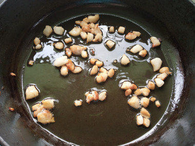 В сковороде разогрейте небольшое количество растительного рафинированного масла. Обжарьте кусочки свинины на сильном огне до полуготовности. Не забывайте мясо перемешивать, чтобы оно не пригорело.