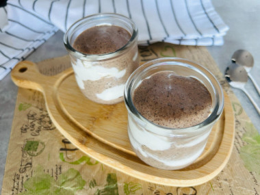 На дно креманок выложить 1-2 ст. л. шоколадной массы, а поверх наносим такую же порцию белого крема. Чередуя слои, заполнить креманки. Можно наоборот начать с белого слоя.