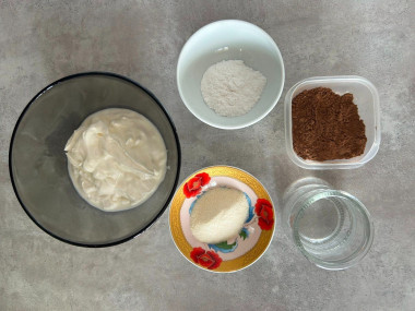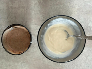 Разделить сметану на две равные части. В одну часть просеять какао и быстро перемешать до однородности.