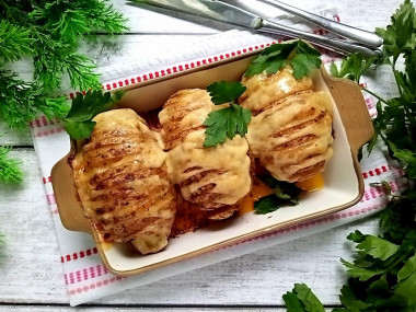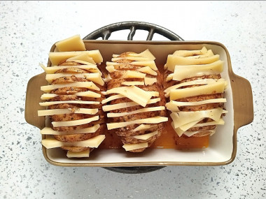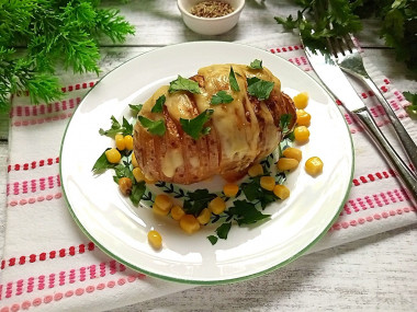 Запекала картошку под фольгой 1 час. Ориентировалась на мягкость, протыкая острым ножом. Затем вложила пластинки сыра и запекала еще 20 минут без фольги. Перед подачей смазала гармошки маслом со дна формы.