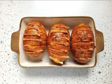 Возьмите форму для запекания, смажьте ее растительным маслом и выложите картофель в форму. Смажьте каждую картофелину оливковым маслом с чесноком и специями, стараясь, чтобы оно попало в разрезы.