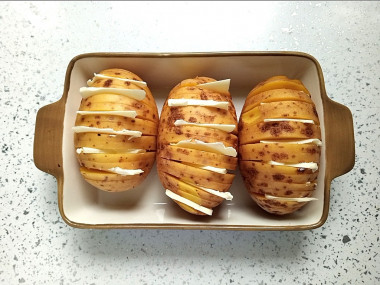 Возьмите охлажденное сливочное масло, нарежьте его тонкими пластинками и вложите в надрезы картофеля через один.