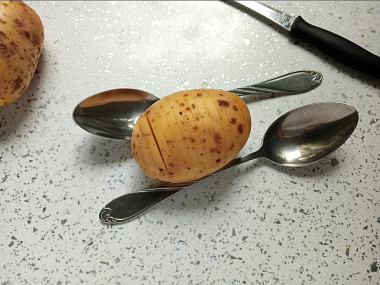 Возьмите картофель, хорошо промойте щеткой с мылом под проточной водой, так как кожуру в этом рецепте очищать не надо, она поможет сохранить форму картофеля. Обсушите его салфетками или бумажными полотенцами. В каждом клубне сделайте глубокие надрезы на расстоянии 5 мм друг о друга. Я использовала ложки, которые плотно уложила с двух сторон, чтобы ограничить ход ножа и делать именно надрез, а не разрез.
