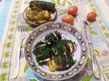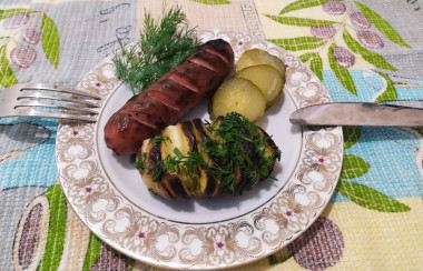 Сливочное масло я разложила сразу, а сыр за пять минут до готовности, перед подачей посыпала свежим укропом и чесночком. Печёные сосиски и солёные огурцы стали отличным дополнением к блюду.
