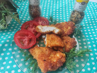 Куриное филе я брала охлаждённое,которое порезала на порционные кусочки. Слегка отбила молоточком. Яйца разбила в одну миску, панировочные сухари насыпала в другую,ну а муку в третью. Соль и специи разделила и добавила поровну в яйца и муку. Хорошо перемешала. Кусочки филе обманула сначала в муку,затем в яйца и потом в сухари. Обжарила на сковороде на растительном масле с двух сторон.