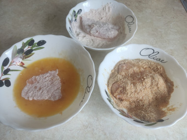 Каждый кусочек мяса обваляйте в муке. Затем окуните в яичную смесь и запанируйте в сухарях.