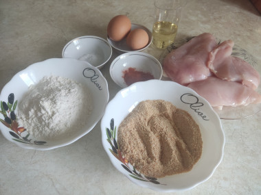 Как сделать куриные грудки в панировке на сковороде? Подготовьте для этого необходимые ингредиенты. Куриные грудки берите без костей, только филе. Ополосните его в проточной воде и обсушите бумажными полотенцами от лишней влаги.