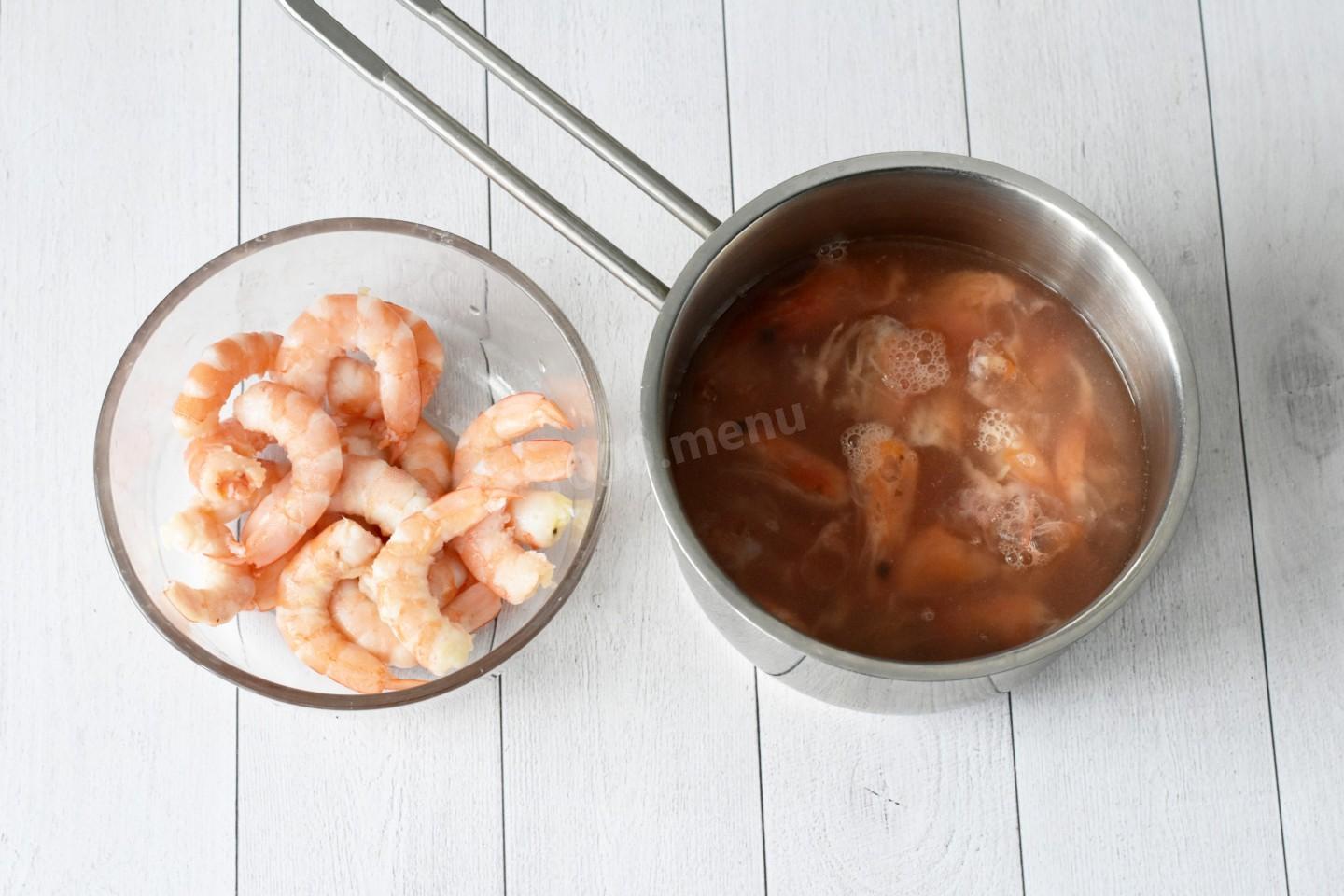 Креветки очистите от головы и панциря. Если креветки замороженные, предварительно их разморозьте. Очистки от креветок выложите в сотейник. Влейте 400 мл воды и на среднем огне доведите ее до кипения. Кипятите бульон 2-3 минуты. Креветочный бульон процедите через сито. Всё о варке креветок читайте в материале под шагами.