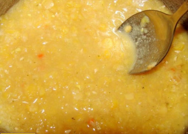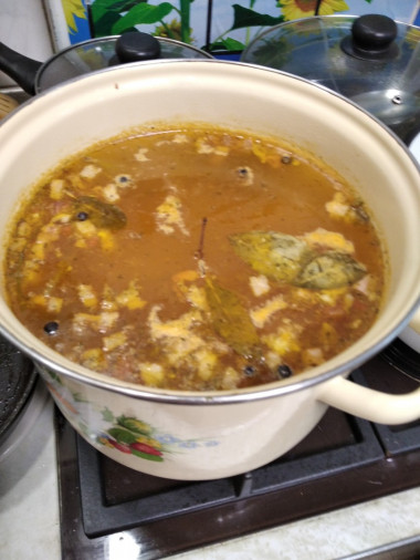За 3-5 минут до готовности попробуйте суп на соль, если надо — добавьте ее. Положите в суп лавровый лист, пропущенный через пресс чеснок, свежую или сухую зелень по вкусу. Выключите плиту и под закрытой крышкой дайте супу постоять 10-15 минут.