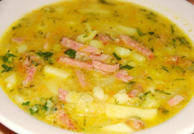 Следом положите нарезанное мясо, зажарку и вот только теперь добавьте соль (учитывая, что ребрышки и колбаса уже соленые). Варите суп около 10 минут до готовности картошки — при надавливании ложкой она должна легко разломиться.