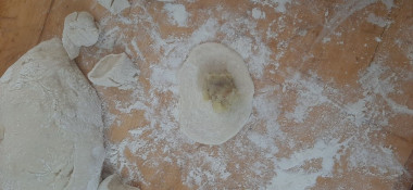 Каждый колобочек разомните руками в лепешку (толщина около 0,5 см). По серединке положите ложку начинки.