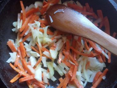 На сковороду налейте немного растительного масла и обжарьте лук с морковью 2-3 минуты.