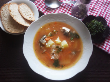Рыбный суп из консервы сардины я увидела случайно, он привлёк моё внимание необычностью- нужно было использовать томатный сок. К тому же нужен был рецепт супа на скорую руку. Как раз были остатки томатного сока и баночка сардин. Сардины у меня в собственном соку, но лук потушу с добавлением томатного сока, что ничуть не хуже. Моркови у меня не оказалось, но ничего страшного, все равно я не очень ее жалую в рыбных супах. Рис и картошку подготовила, бросила в кипящую воду, минут через 15 добавила сардины и потушенный в томатном соке лук. Не забыла про специи- у меня это соль, перец, молотый кориандр, лавровый лист. Вот и всё, ароматный суп на скорую руку готов. Однозначно добавляю к себе в копилку и буду готовить еще не раз.