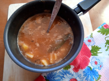 Готовую зажарку выложите в кастрюлю с супом. Добавьте сардины. В кастрюлю подсыпьте немного соли и специи. В качестве специи я ограничилась лишь молотым перцем. Проварите все вместе еще 5 минут. Рис и картофель должны стать мягкие.