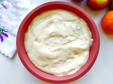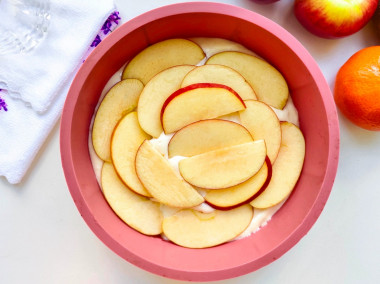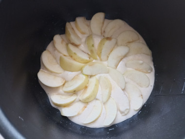 Чашу мультиварки смажьте растительным маслом, выложите нарезанные яблоки и залейте их тестом.