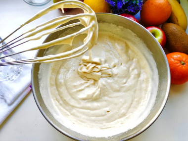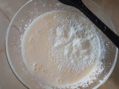 Отмечу, что если взбить яйца до густой пены, то тесто получится пышное и не нужно будет добавлять соду, разрыхлитель и т.п. В готовую массу постепенно вмешала просеянную муку, как по рецепту 200 гр. Чтобы пена не осела лучше аккуратно вмешивать силиконовой лопаткой или венчиком.