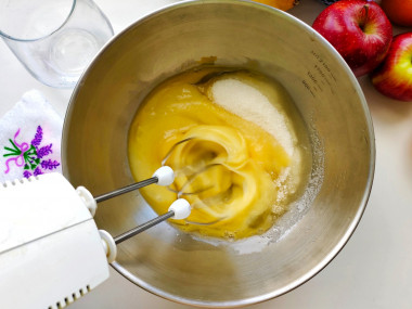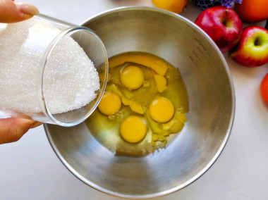 Вбейте куриные яйца в глубокую миску. Насыпьте сахар и ванилин, хорошо взбейте всё миксером, пока яичная смесь не увеличится в объеме.