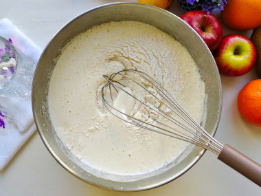 Просейте муку несколько раз, чтобы тесто получилось легкое и пышное. Введите муку в яичную массу в несколько приемов, осторожно перемешивая венчиком.