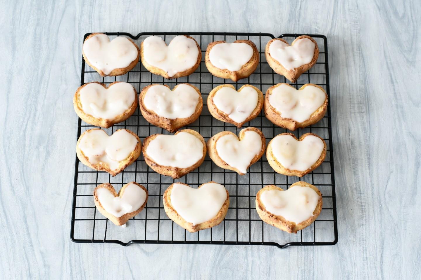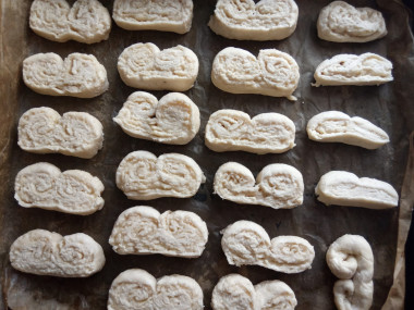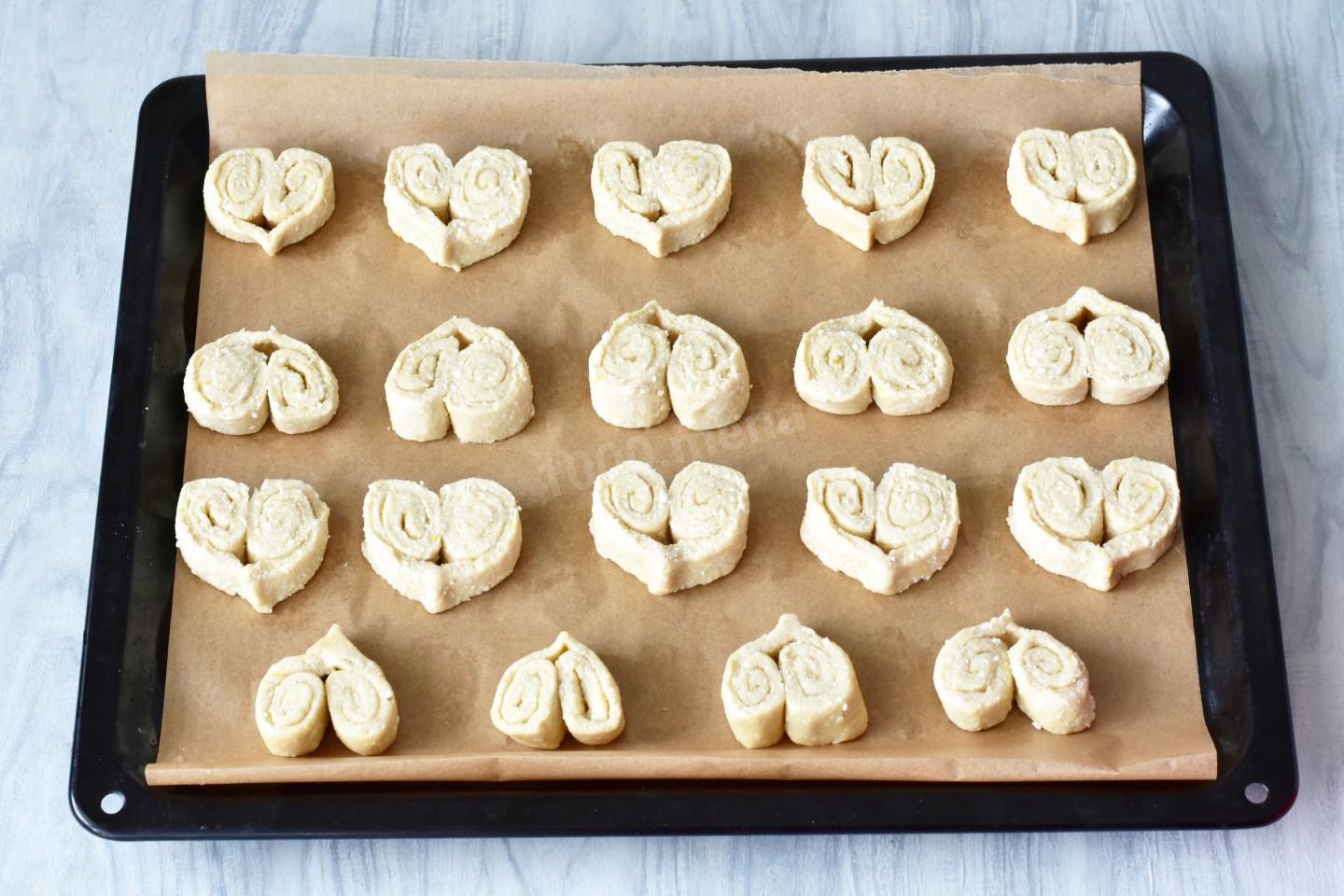 Острым ножом нарежьте тесто на ломтики толщиной не более 1,5 см. Получившиеся заготовки выложите срезом вверх и расправьте, придавая им форму сердечек