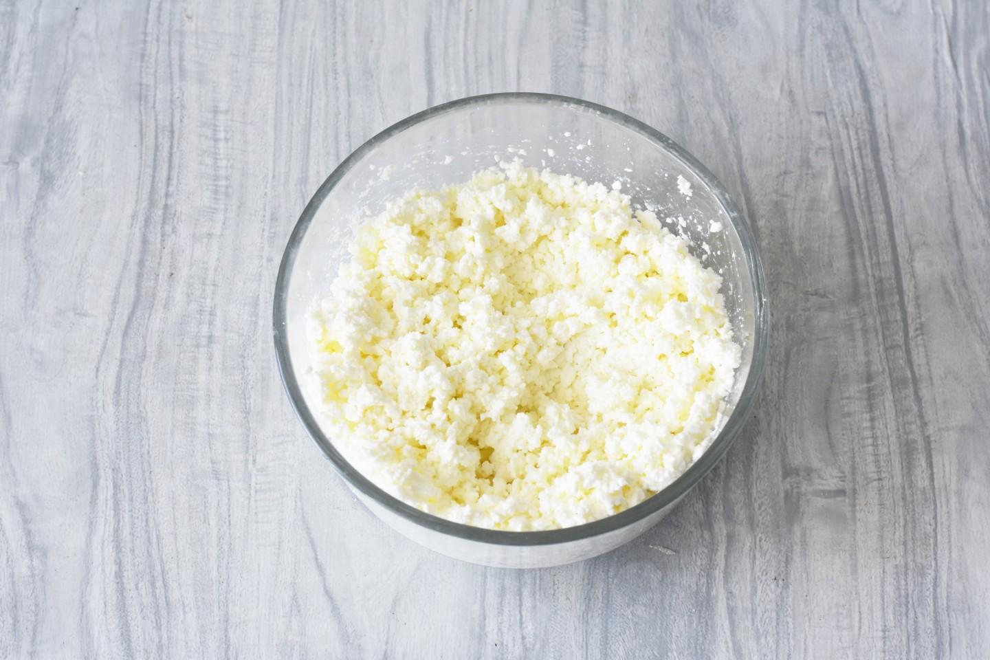Творог предварительно разомните вилкой. Творог берите в меру влажный, не комковатый, без мелких твердых крупинок, жирностью 5-9%. Если творог комковатый, сухой и плотный, лучше предварительно протрите его через сито или пробейте блендером. Как выбрать творог читайте в отдельной статье. Ссылка в конце рецепта под шагами.