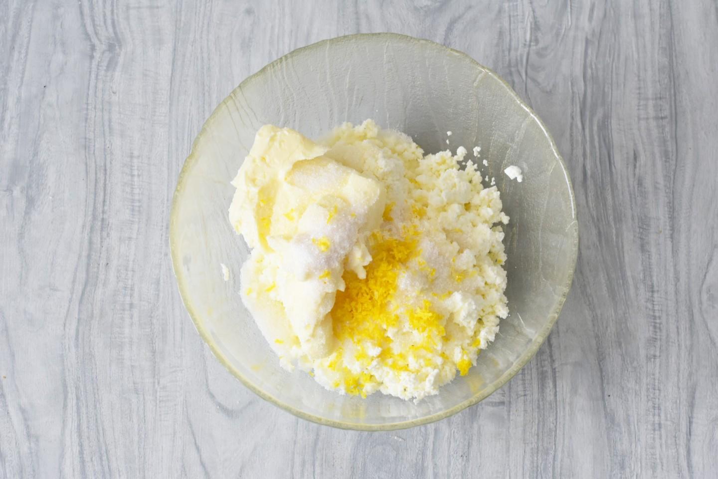 В миске соедините творог, сливочное масло комнатной температуры, тертую лимонную цедру, сахар, ванильный сахар и соль. Все тщательно вымесите лопаткой до однородности.