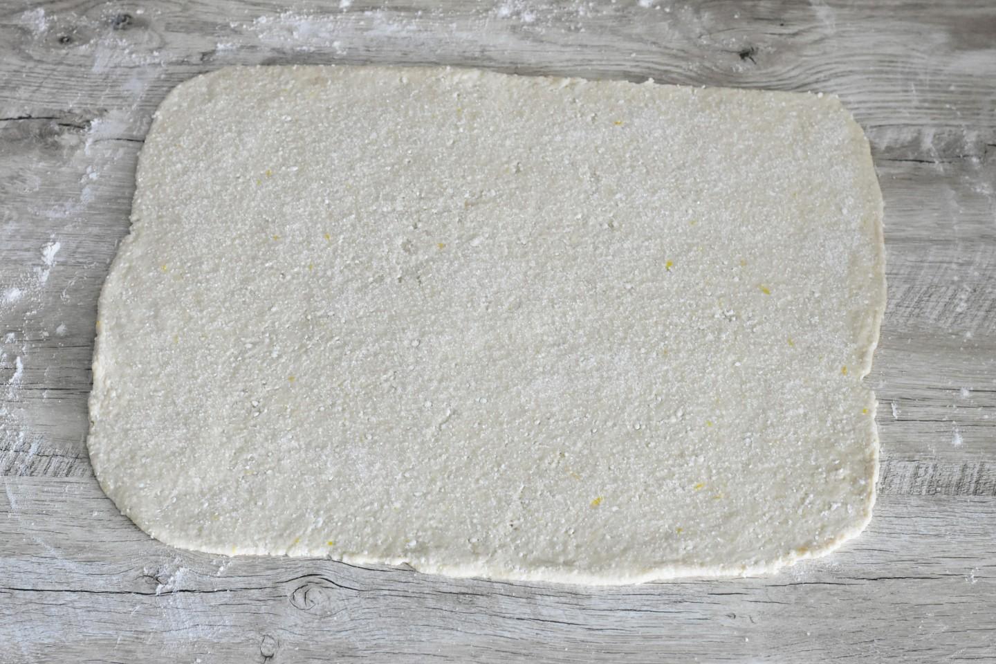 Духовку заранее включите на 180℃. Охлажденное тесто раскатайте на присыпанном мукой столе в ровный прямоугольный пласт толщиной около 2 мм. Сверху равномерно посыпьте сахаром.