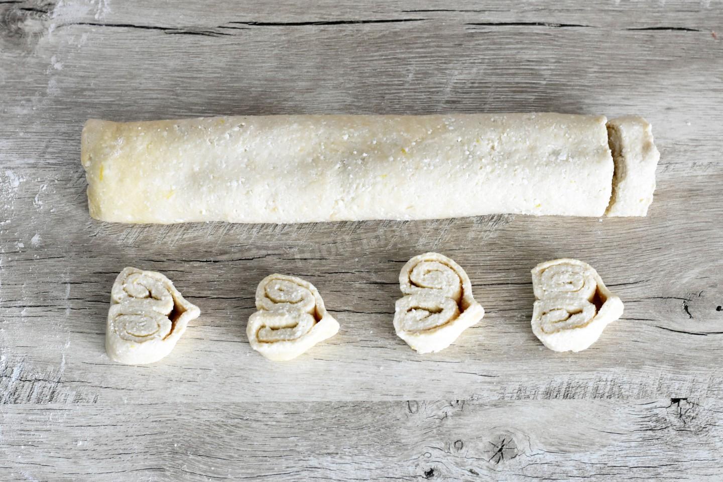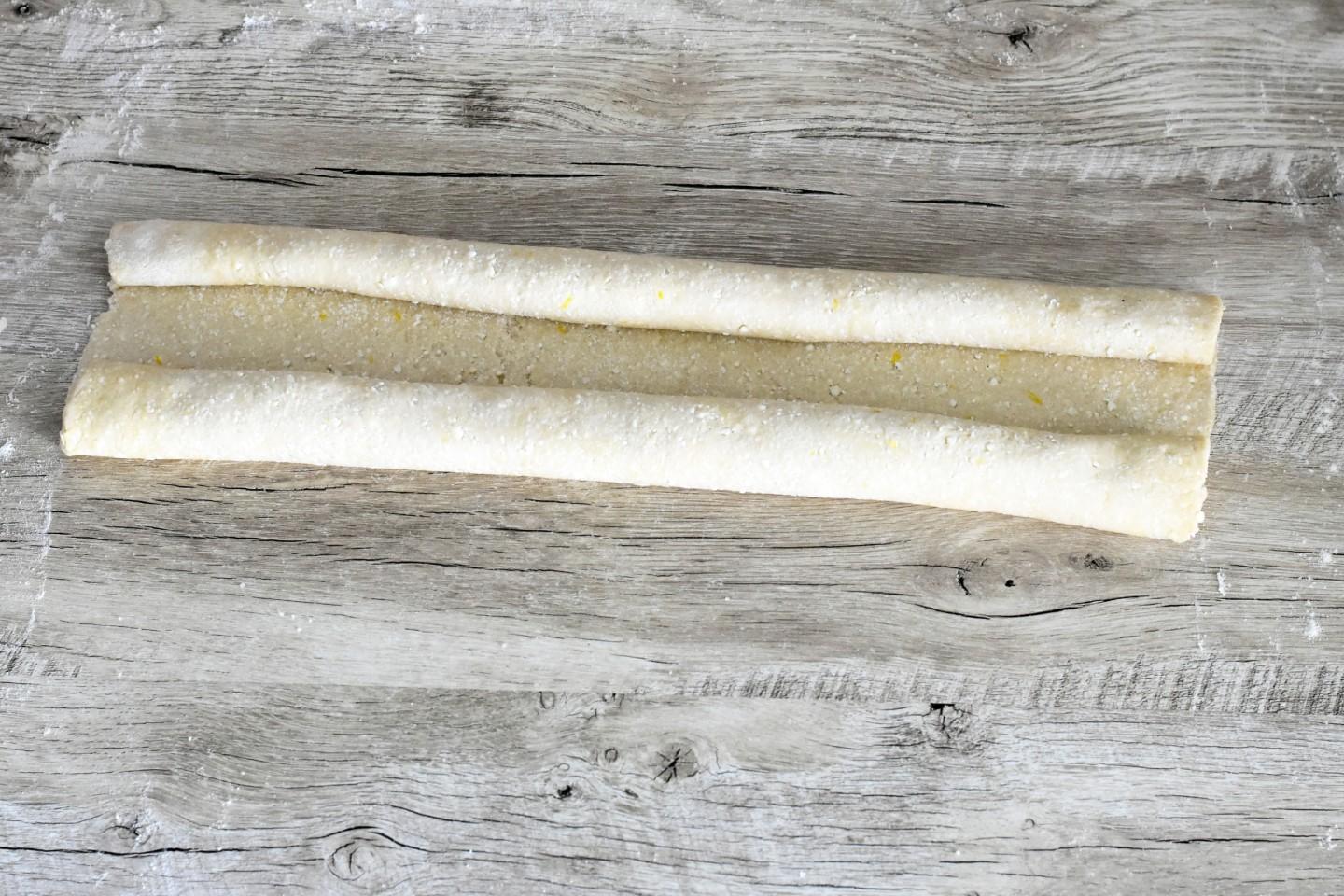 Противоположные края теста скатайте рулетиками от краев, так, чтобы они соединились к середине.