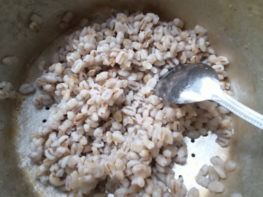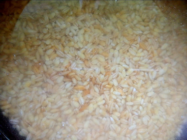 Крупу проверьте на наличие личинок, мусора и поврежденных зерен. Хорошо промойте. Чтобы крупа получилась рассыпчатой, надо промывать ее до тех пор, пока вода не будет абсолютно прозрачной. Перловка варится достаточно долго, но для того, чтобы процесс варки ускорить, можно замочить крупу на несколько часов в холодной воде. Удобно замачивать на ночь. Затем воду, в которой замачивалась крупа, слейте.