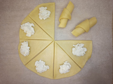 На широкий край каждого треугольника разложите по 1 ч. л. творожной начинки. Сверните треугольники рулетиками от широкого края к узкому. Получатся рогалики среднего размера.