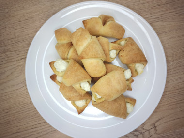 Переложите заготовки на застеленный пергаментом противень. Выпекайте рогалики с творогом в предварительно разогретой до 180º духовке 15-20 минут до золотистого цвета. Я выпекала сразу на режиме "верх+низ". Точное время определяйте по своей духовке. Приятного аппетита!