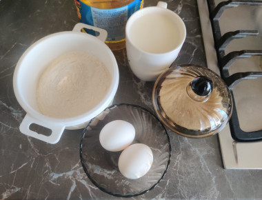 1. Кефир наливаем в миску, разбиваем куриные яйца, насыпаем сахар, соль и соду, перемешиваем.