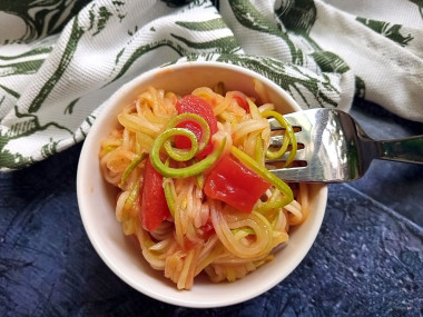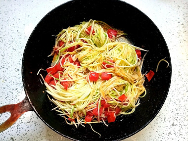 Мне хотелось приготовить из кабачков что-то оригинальное, обратилась к поиску на сайте и нашла удивительный рецепт спагетти из кабачков. Сначала подумала, что кабачки маринуются. Но в процессе стало понятно, что это скорее горячее блюдо. Кабачки я натирала на тёрке для корейской моркови, чтобы добиться вида "спагетти". Внутренню часть с семечками не использовала. Помидоров взяла три штуки, обжарила их вместе с чесноком до характерного запаха, а потом добавила кабачки. Автор не рекомендует их перемешивать, но я рискнула и несколько раз перемешала двумя вилками. Посолила после приготовления, чтобы кабачки не размякли. Вид у этого блюда действительно напоминает спагетти, дочка даже перепутала сначала) Кабачки остались целыми, хрустящими. Мне понравились жареные помидоры, очень ароматные и вкусные. Чеснок тут отлично дополняет блюдо. "Помидорное" масло пропитало пасту из кабачков и она стала красноватого цвета. Мне это блюдо понравилось в горячем виде. А мужу в холодном) В любом случае это вкусно, пряно, ароматно и необычно!