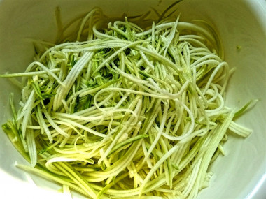 Сделайте пасту из кабачка. Для этого кабачок помойте и обсушите. Отрежьте кончики. Как порезать кабачок как спагетти? Натрите кабачок на терке для корейской моркови. Если у вас ее нет, то нарежьте его ножом. Сначала на тонкие слайсы, а затем их вдоль на полоски, имитирующие спагетти.