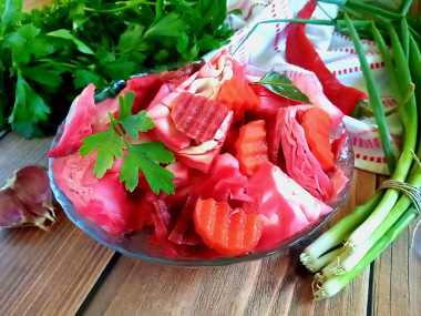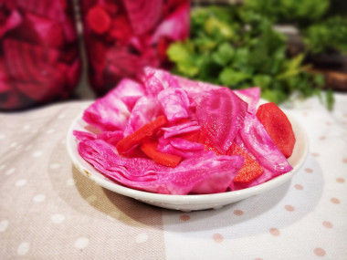Свекла в этом рецепте выполняет не только вкусовую, но и эстетическую функцию. Пигмент бетанин, содержащийся в свекле, является натуральным красителем и проникает в волокна капусты, окрашивая ее в красивый розовый цвет, что делает закуску особенно привлекательной.