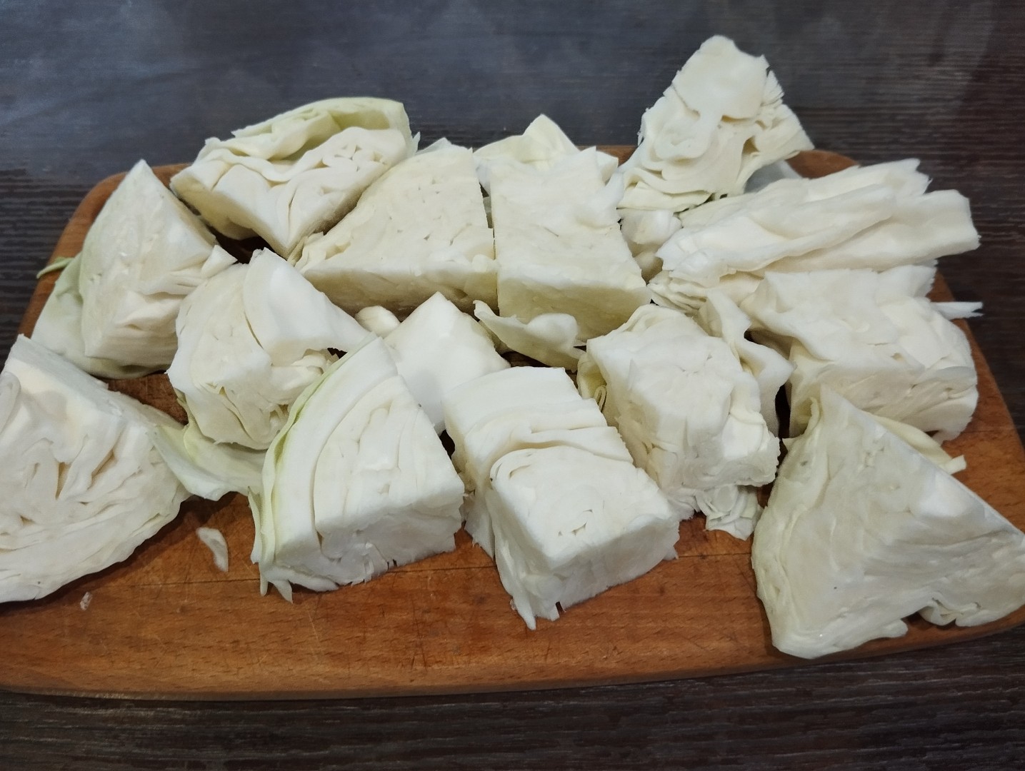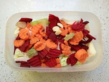 Капуста мне как раз попалась рыхлая, сочная. Нарезала ее кусочками. Свеклу и морковь нарезала пластинками фигурным ножом. Зубчики чеснока тоже разрезала на пластинки, так они лучше отдают свой остренький вкус и аромат.