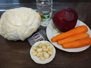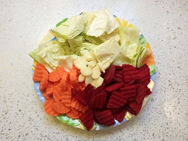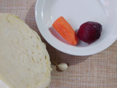Свеклу и морковь тщательно вымойте с помощью щётки или жесткой мочалки, очистите, после чего снова обмойте. Удалите верхние листья с капусты. Нарежьте все овощи крупными кусками. Зубчики чеснока очистите от шелухи и разрежьте пополам.