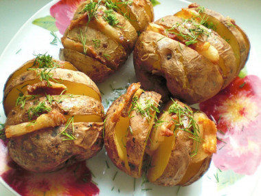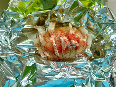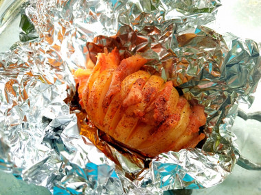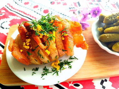 Картошку с салом в фольге запекала впервые. Обычно я просто выкладываю в форму начиненные клубни и ставлю в духовку. Вариант с фольгой мне понравился больше, картошка при этом получается более мягкой и нежной. Я использовала сыровяленный бекон, который готовила ранее, в нем много мяса) Картошка молодая, я ее помыла со щеткой и надрезала. Конечно молодую картошку резать труднее, чем "старую", но зато она гораздо вкуснее и полезнее. Мне сначала показалось, что картошку нужно посолить, но потом стало ясно, что это лишнее. Соленое сало поделилось с картошкой не только жирком, но и солью. Получился прекрасный баланс вкуса. Перед запеканием я посыпала клубни копченной паприкой для запаха и цвета. Запекала примерно час, готовность определяла острым ножом. Картошечка просто чудо! Она хорошо пропиталась нежными соками от сала, а мясная прослойка бекона поджарилась, подрумянилась, стала немного хрустящей. В общем это отличное горячее блюдо, рекомендую!