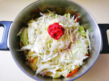 Лук и морковь я обжарила на сковороде до мягкости, затем переложила зажарку в кастрюлю, выложила туда же нарезанную картошку, добавила воды и поставивила на небольшой огонь тушиться. Через 5 минут добавила в кастрюлю нашинкованную капусту, томатную пасту, соль и нарезанный чеснок, влила еще немного воды, тушила под крышкой минут 20 до готовности овощей. В самом конце добавила перец.