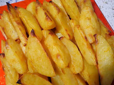 Всегда думала чтобы такого приготовить на гарнир к праздничному столу. И в последнее время открыла для себя картошку, запеченную дольками. Запекаю ее с разными специями. Самое главное, чтобы каждая картофельная долька была покрыта тонким слоем растительного масла. Тогда готовые кусочки очень напоминают картошку фри, внутри мягкая пушистая сердцевина, а снаружи хрустящая румяная корочка. Этот рецепт полностью соответствует моему вкусу) Специи в виде карри, паприки и свежемолотого перца сделали картошечку ароматной, красивой и вкусной. Немного остринки не помешает нейтральной по вкусу картошке) Подавала картофельные дольки с разными соусами, особенно мне понравилось обмакивать в соус терияки. Это очень вкусно, к тому же удобно брать гостям с общей тарелки. Спасибо за рецепт!