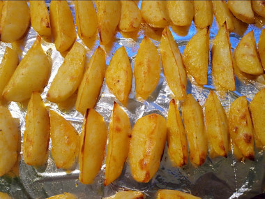 Поставьте картофельные дольки в предварительно разогретую до 190-200 градусов духовку. Запекайте примерно 30-40 минут. Как только дольки аппетитно подрумянятся и будут мягкими внутри - вынимайте.