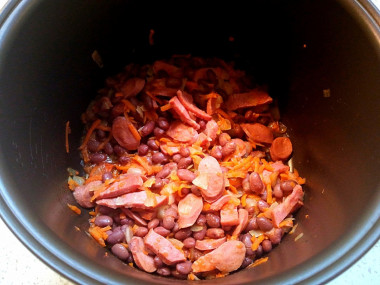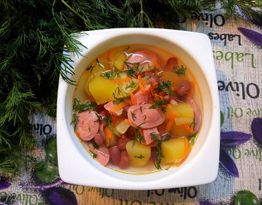 Буквально только что сварила вкуснейший суп с охотничьими колбасками. Нужно было срочно приготовить суп на завтра, а сил уже не было. Стала искать рецепт супа с консервированой фасолью, чтобы затратить поменьше сил и времени. И нашла этот чудесный рецепт. Суп у меня сварился максимум за 25-30 минут. Одновременно поставила варить картошку в кастрюле и стала обжаривать лук, морковь, колбасные изделия и фасоль в мультиварке. В мультиварке выставила режим "жарка" на 15 минут. Половину времени обжаривала лук с морковью, а потом добавила сосиски с колбасой. Потом фасоль. Фасоль была без томата, поэтому добавила домашний кетчуп. Как раз и картошка свалилась. Соединила все вместе, добавила нарезанный укроп для большего аромата и довела до кипения. Потом еще оставила настояться под крышкой. Лук с морковью у меня были замороженные, это ускорило процесс. А еще мне понравилось использовать мультиварку в качестве сковороды. Суп получился просто шикарный, не смотря на простоту. Очень вкусный, ароматный, с явным привкусом колбаски.