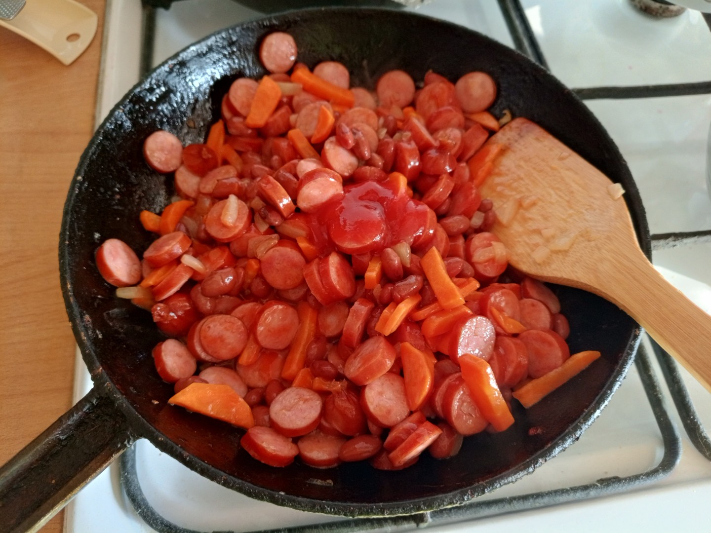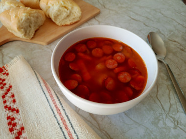 Суп вышел наваристым, с приятной густотой от томатной пасты. Заправка из обжаренных колбасок, лука и моркови добавила аромата и глубины. Подавала с домашним чесночным хлебом — сочетание получилось идеальным.