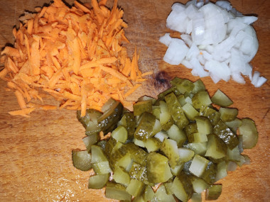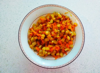 В это время натрите морковь на терке, лук мелко нарежьте. Выложите измельченные овощи на горячую сковороду с добавлением небольшого количества растительного масла. Обжарьте все вместе 2-3 минуты.
